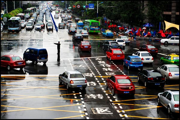 ![]() Chengdu, China--- A traffic policeman directs traffic on a rainy day. |