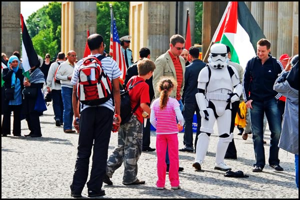 ![]() Berlin, Germany ---Protestors, tourists and a stormtrooper in front of the Brandenburg Gate. |