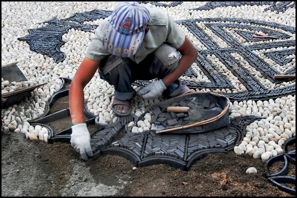 ![]() Lijiang, China --- A worker lays tiles for an intricate patterned pavement. |