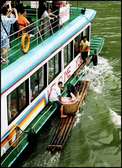 ![]() Gulin, China --- A vendor from a bamboo raft makes a risky jump for a sale. |