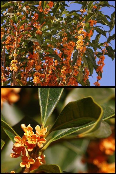 Osmanthus fragrans aurantiacus, Oleaceae (Sweet Olive) Fragrant bright orange flowers from Sept. to Oct. Aromatic leaves Evergreen |