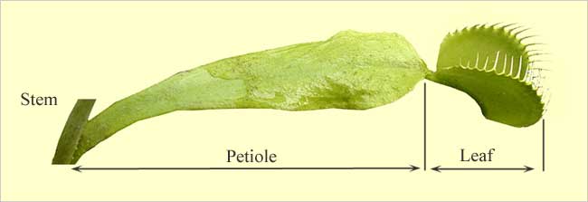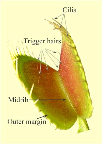 Trapping system:A Venus flytrap leaf has two regions: a long heart-shaped petiole that is capable of photosynthesis; and a two-lobed trap-like leaf blade. The leaf blade is covered with mesh-like cilia. |