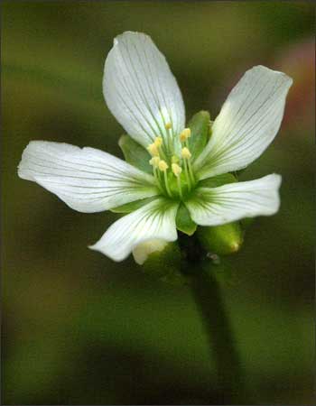 ![]() A flowering Venus flytrap: Each flower has five sepals and five petals on a long stalk. There are many stamens (usually 15) and one compound pistil. |