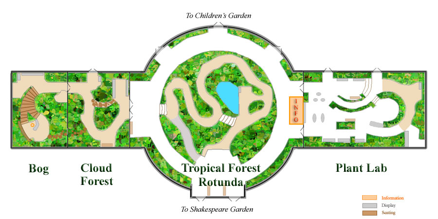 | This website is a collection of my pictures and related information for the conservatory exhibitions. I hope it can give a preview for those who haven't visited the conservatory. For those who have visited, I hope it can provide a review and an inspiration for you to find out more about botany. You can visit the different sections of conservatory by clicking on that section on the following map. |