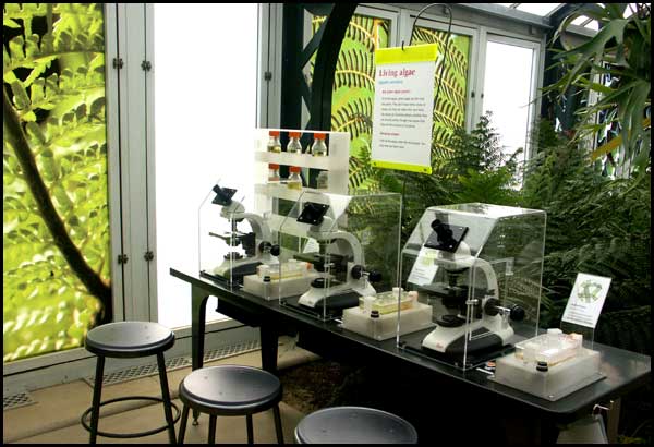 | This exhibit displays Microsterias, Spirogyra, and Hydrodictyon algae: | ||