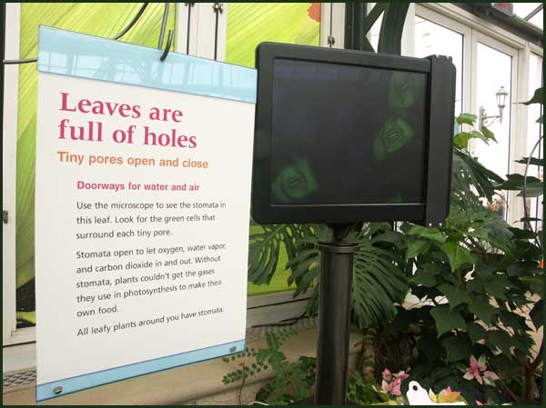 StomataAll leaves have tiny pores that are used for gas exchange. These pores are called stomata (singular: stoma), and are usually found on the underside of a leaf. To prevent dehydration through open pores, a pair of guard cells surrounds each stoma to regulate its opening and closing. At this exhibit, you can see clear pictures of stomata and guard cells underneath a microscope. |