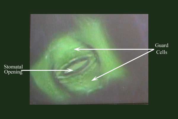 A microscopic view of a stoma and its guard cells: ![]() The guard cells are green since they contain chloroplasts. |