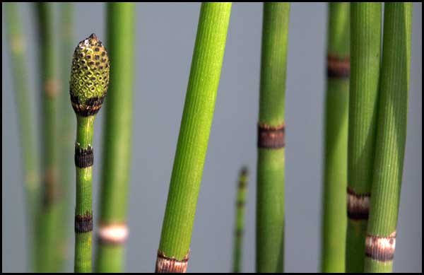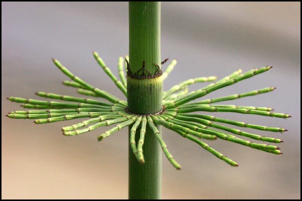 ![]() An unbranched horsetail: the scale-like leaves form whorls around a node. |
