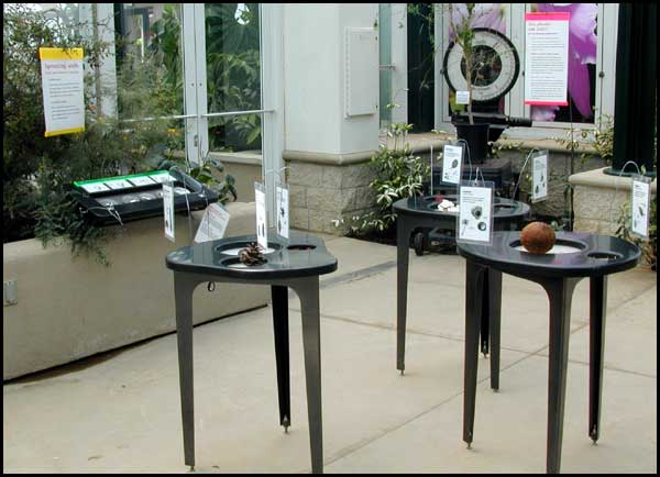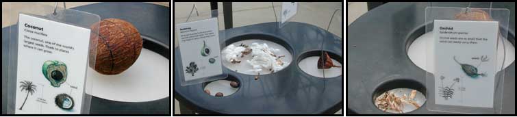 Different seeds![]() From dustlike orchid seeds, to coconuts (one of the world's largest seeds, a drupe with a fibrous outer layer), there are many different types of seeds in this exhibit. Different seeds develop different structures and appearances according to their dispersal methods. |