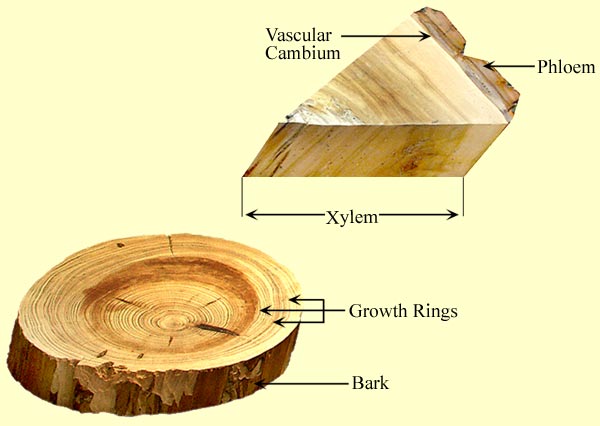 | Tree trunks are big stems of woody plants. They need to support the trees and position the leaves as far away from the ground as possible. 80% of the trunk is made up of dead cells. The living cells are thin layers next to the growing layer of vascular cambium. |