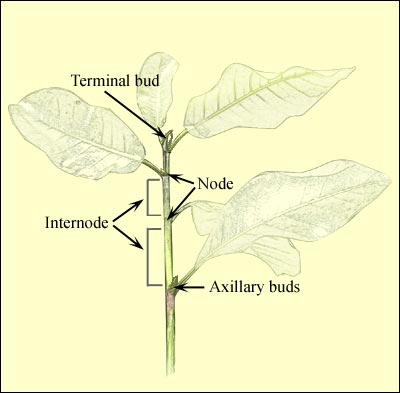 of the stem. In order to space out leaves and branches, a growing terminal bud inhibits the development of lateral buds: this