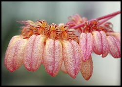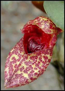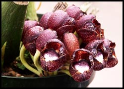 ![]() Bulbophyllum frostii Common name: Ruby slippers Flower size: ~1" (2.5 cm) |