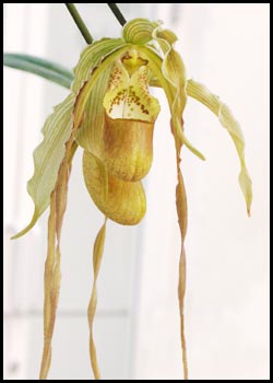 ![]() Phrag Paul Eugene Conroy wallisii x longifolium Long petals: ~ 10" (25 cm) |