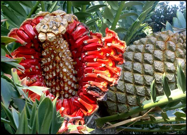 ![]() Seeds with orange-red sarcotesta (seed coat) on an opened seed cone Encephalartos arenarius, Zamiaceae |