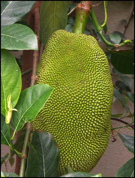 JackfruitArtocarpus heterophyllus, MoraceaeJackfruit is the world largest tree-borne fruit. It can weigh more than 100 lbs! Because of their large sizes, jackfruits are usually grown directly from the main branches and the trunk. Each jackfruit is developed from multiple ovaries so it is a compound fruit like a pineapple. The tree is monoecious so each tree produces both male and female flowers. They can be pollinated by wind or insects. |