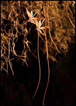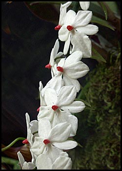 Aerangis (Aergs.)(Gk: aer: air; angos: urn) Subfamily: Vandoideae.About 50 species. Mostly tropical Africa. Mostly epiphytes, some lithophytes. Many flowers with long, nectar-filled spurs on raceme. |