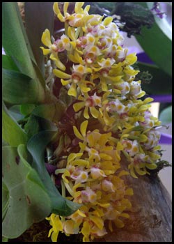 Gastrochilus (Gchls)(gastro: stomach; cheilus: lip)Epidendroideae. About 20 species. Native to E. Asia to Malaysia. Epiphytes. Monopodial growth. |