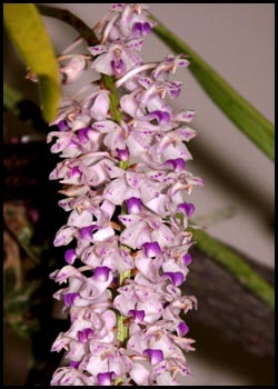 Rhynchostylis (Rhy.)Epidendrodeae.Six species. From SE India to Philippines. Mostly sweet scented. Monopodial growth. |
