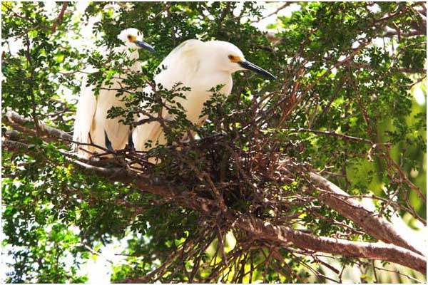 Snowy Egrets breed once a year. They usually set up their nests on trees or shrubs and share their labors to build their nest: the male collects materials for the female to do the construction.